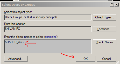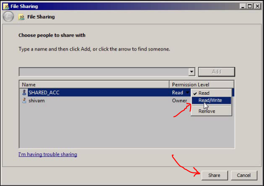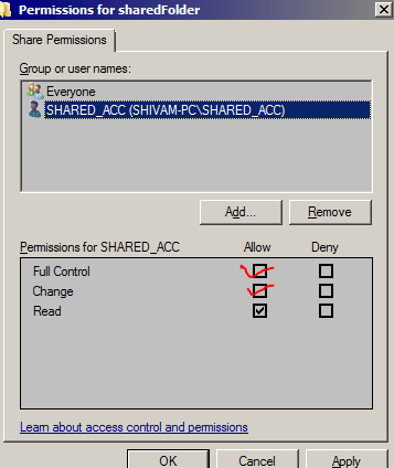 - Right click on folder ->share with specific people -> select newely created account -> give read and write permission